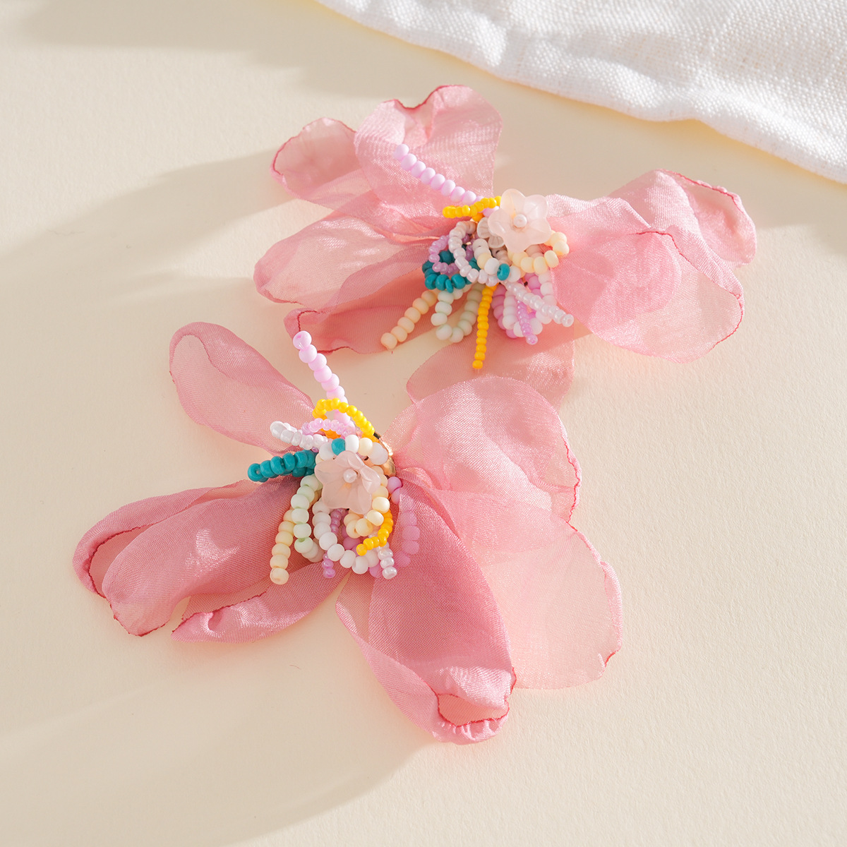 Chiffon Flower with Glass Bead Center Dangle Earrings