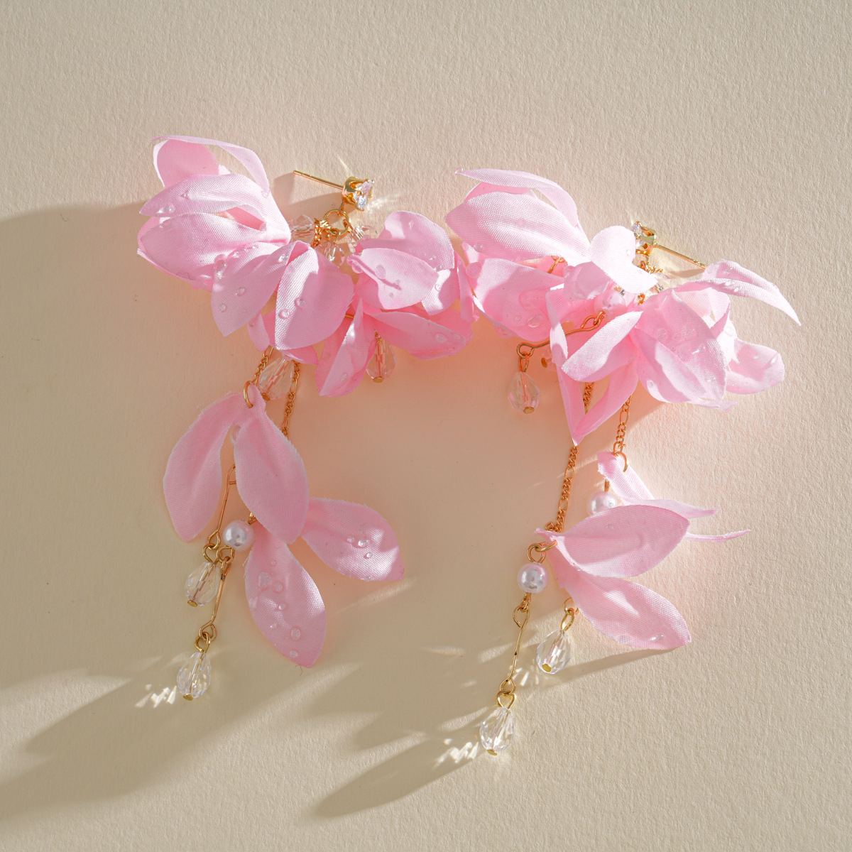 Fabric Flower with Delicate Tassel Dangle Earrings