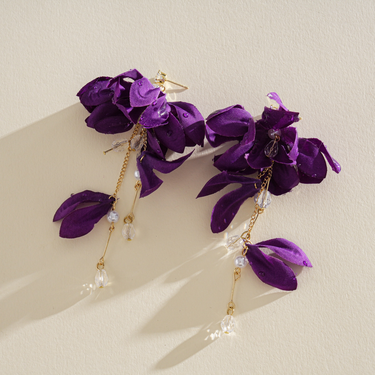Fabric Flower with Delicate Tassel Dangle Earrings